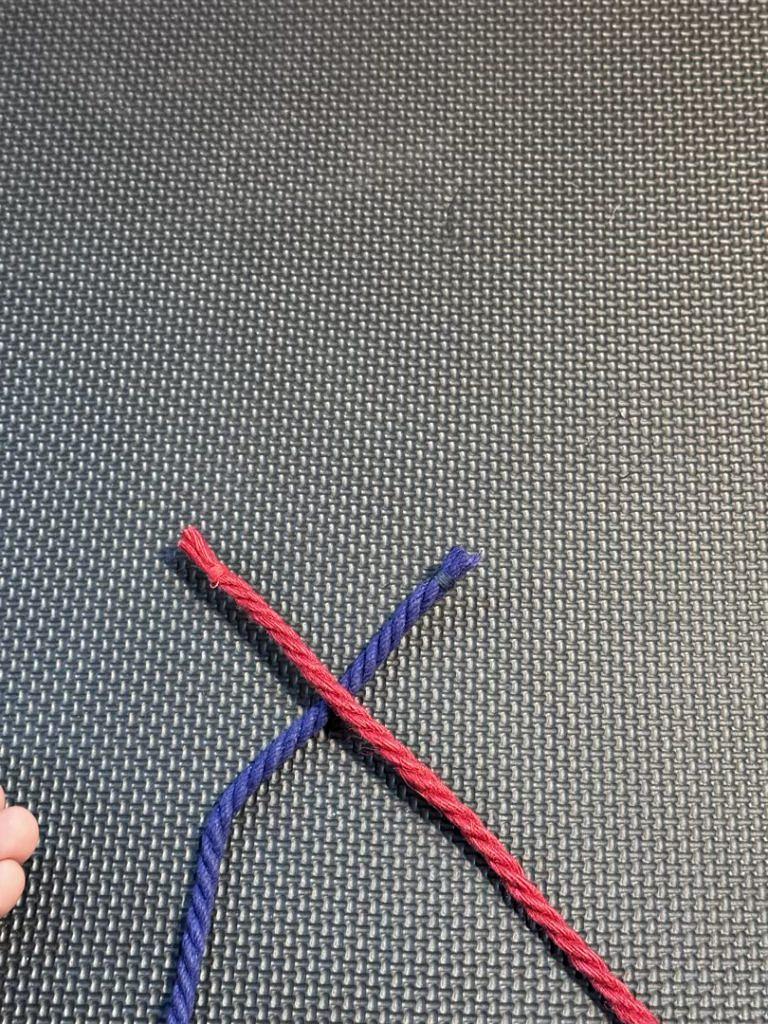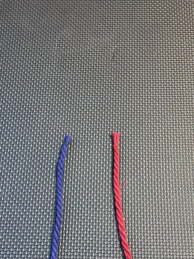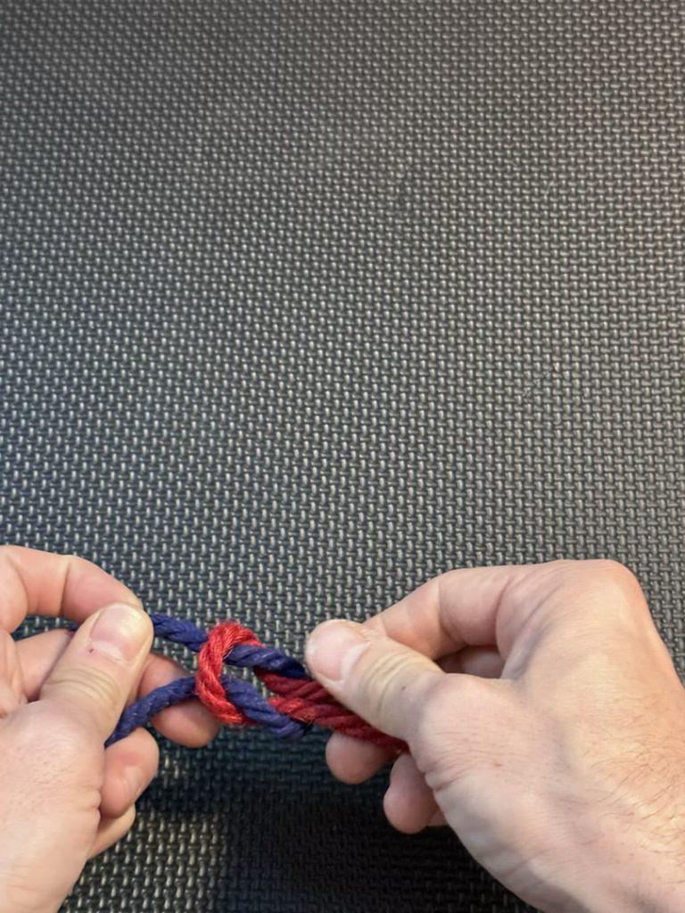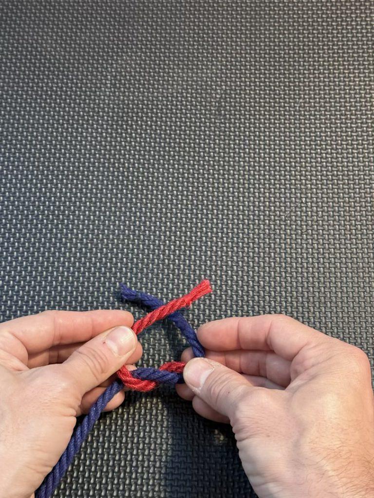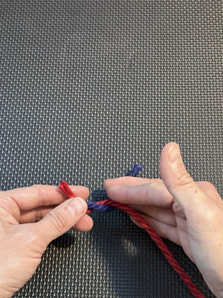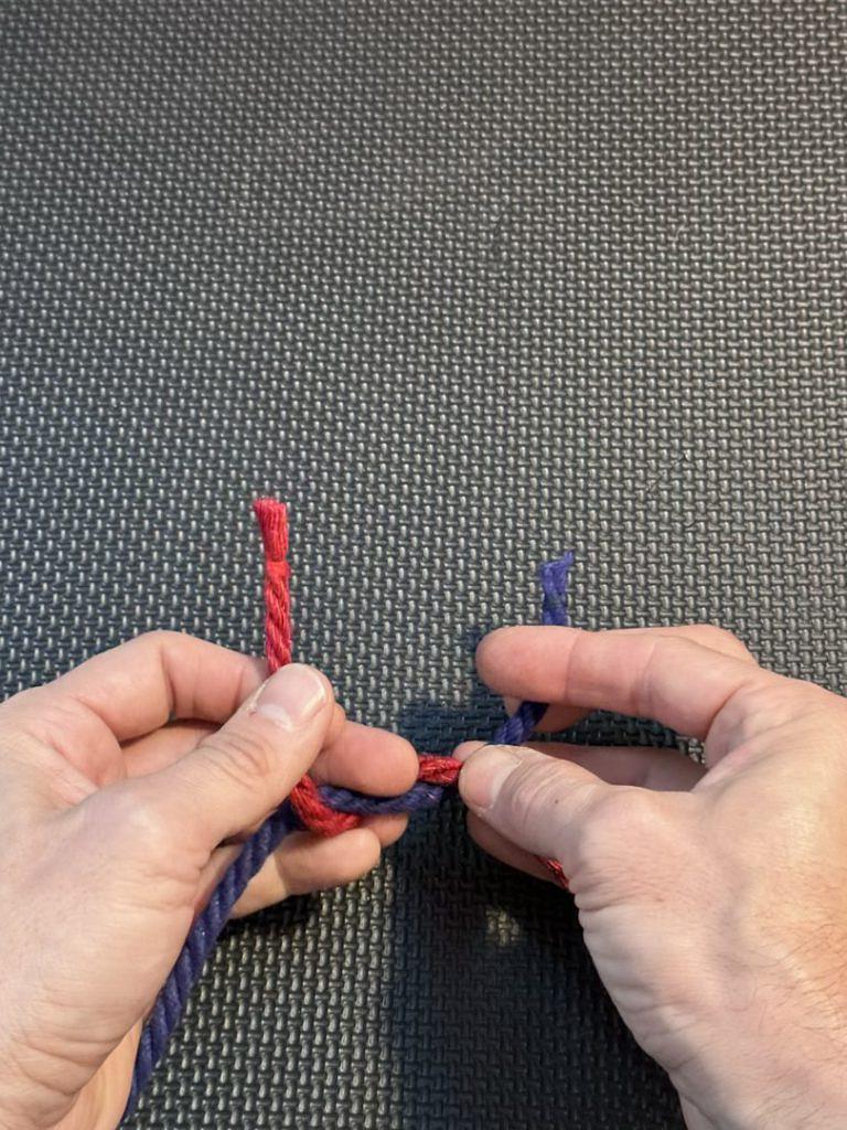When we first learn the Square Knot and the Granny Knot, we use a single strand. In this case, our left strand of rope is blue, and the right strand is red.