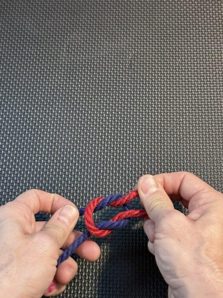 Once you’ve gone one rope over the other, remember to go through, which means pulling the end through the loop all the way around.